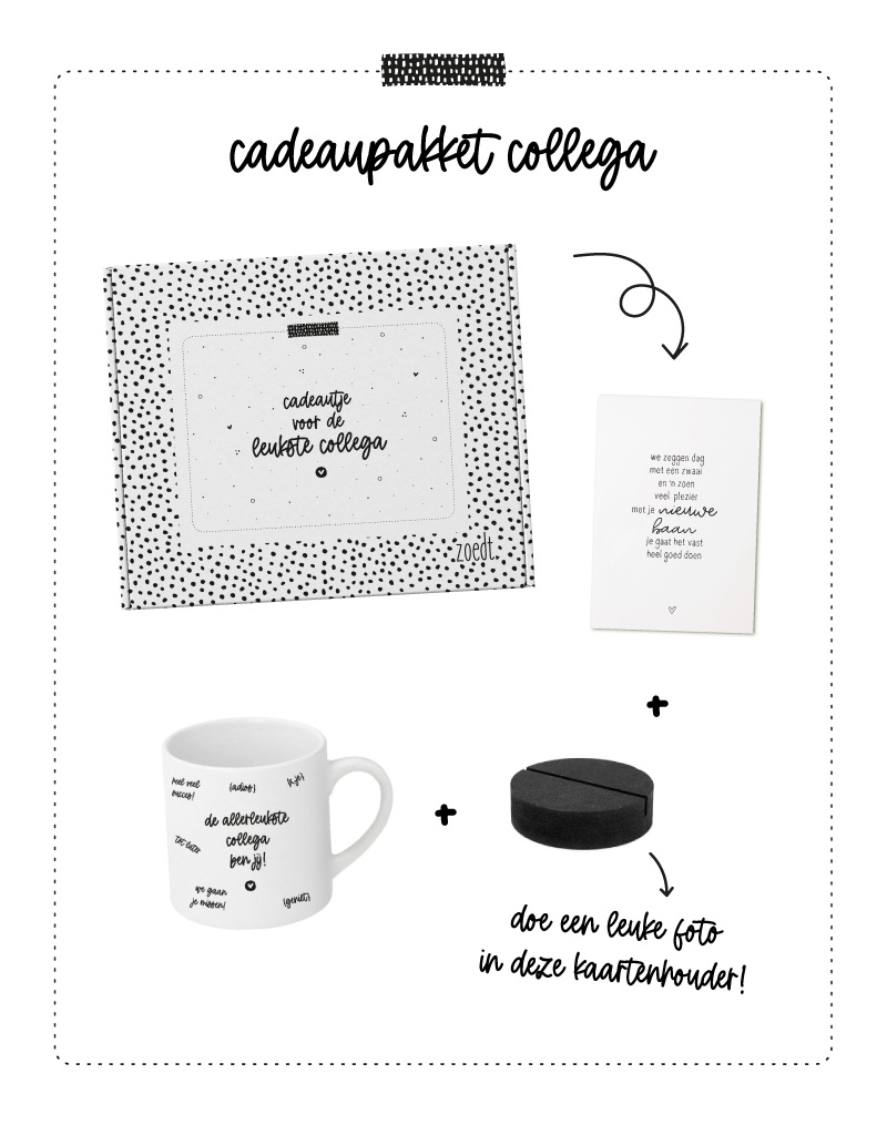 In het pakket zit een heerlijke mokje voor koffie, thee of of andere dranken met een lieve tekstjes voor je collega. Er zit ook een ronde zwarte kaartenhouder in het pakket, hier kun je een leuke foto van je team, of een grappige foto van je collega in doen. Of doe hier de kaart in, die ook in het pakket zit. Op de kaart staat een leuk toepasselijk gedichtje. Op de achterkant van de kaart kun je een persoonlijke boodschap schrijven.