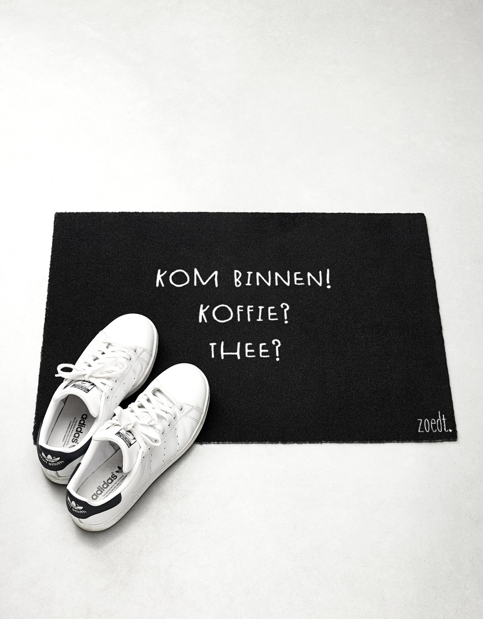 Mooie deurmat zwart met wit tekst 'Kom binnen! Koffie? Thee?'