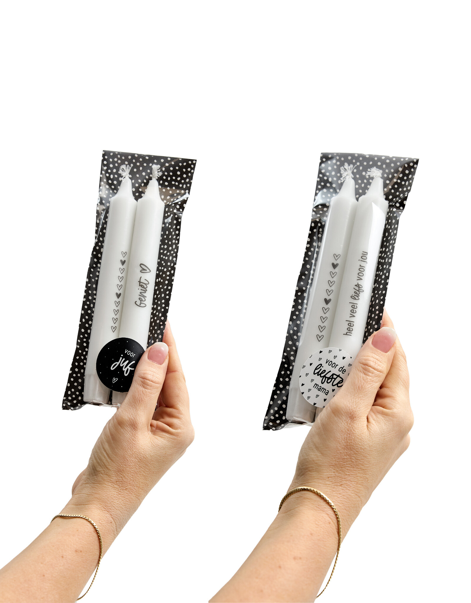 Op de ene kaars staan subtiele hartjes, op de andere de tekst ‘Voor de liefste moeder’. Een stijlvolle en persoonlijke manier om jouw waardering te laten zien.