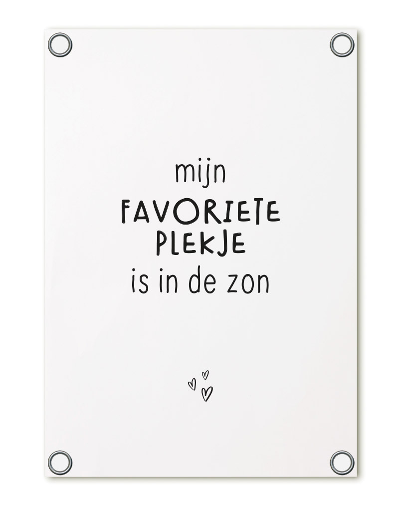 Tuinposter wit met tekst 'Mijn favoriete plekje is in de zon' – buitenposter voor tuin & terras