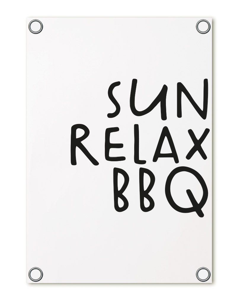 Tuinposter wit met tekst 'Sun Relax BBQ'– buitenposter voor tuin & terras