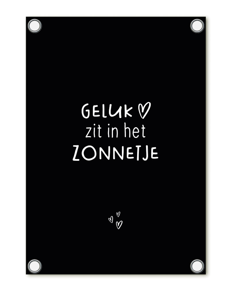 Tuinposter zwart met tekst 'Geluk zit in het zonnetje' – buitenposter voor tuin & terras