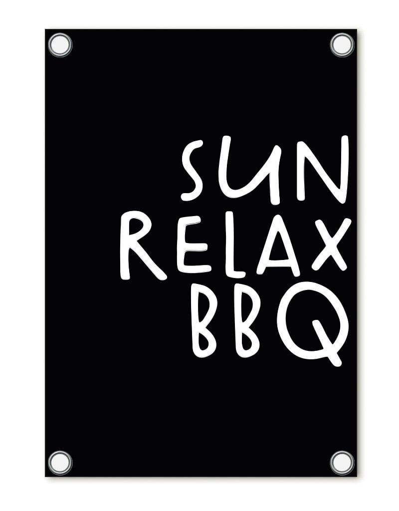 Tuinposter zwart met tekst 'Sun Relax BBQ'– buitenposter voor tuin & terras
