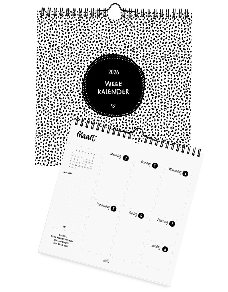 De nieuwe weekkalender 2026 is dé favoriet voor je bureau, keuken of werkplek. Deze zwart-wit kalender is strak vormgegeven en biedt elke week een duidelijk overzicht, met ruimte voor notities, afspraken of weektaken.