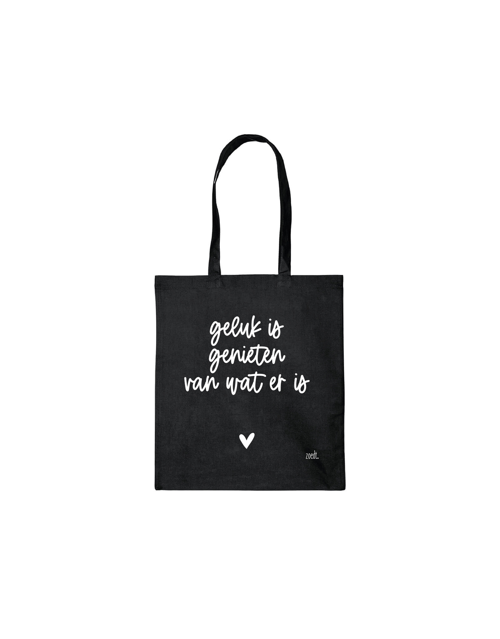 Zwarte katoenen tas met tekst 'Geluk is genieten van wat er is'
